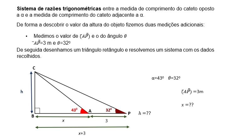 encontrar a altura do objeto de estudo, usámos vários métodos trigonométricos.